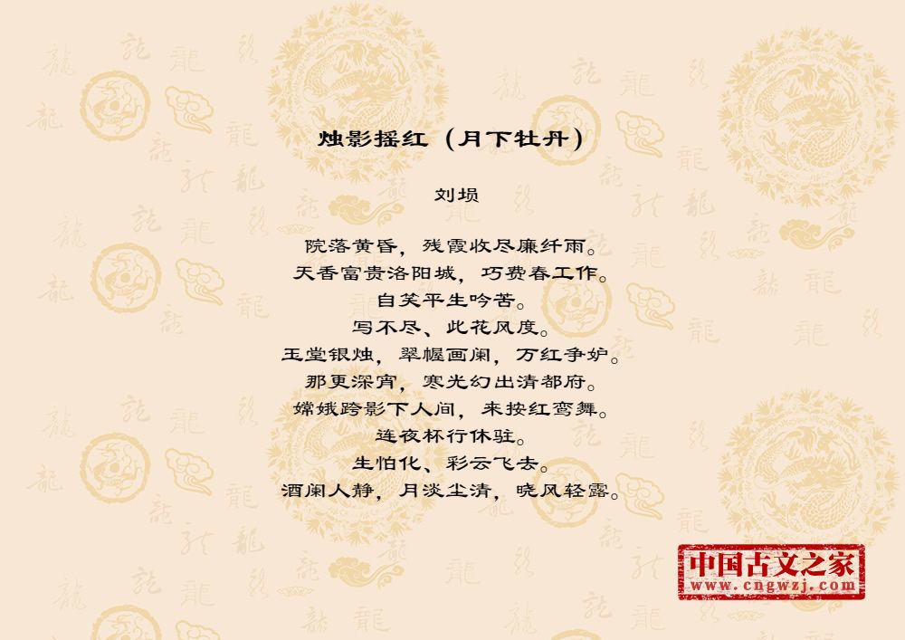 院落黄昏,残霞收尽廉纤雨。天香富贵洛阳城,巧费春工作。自笑平生吟苦。写不尽、此花风度。玉堂银烛,翠幄画阑,万红争妒。那更深宵,寒光幻出清都府。嫦娥跨影下人间,来按红鸾舞。连夜杯行休驻。生怕化、彩云飞去。酒阑人静,月淡尘清,晓风轻露。