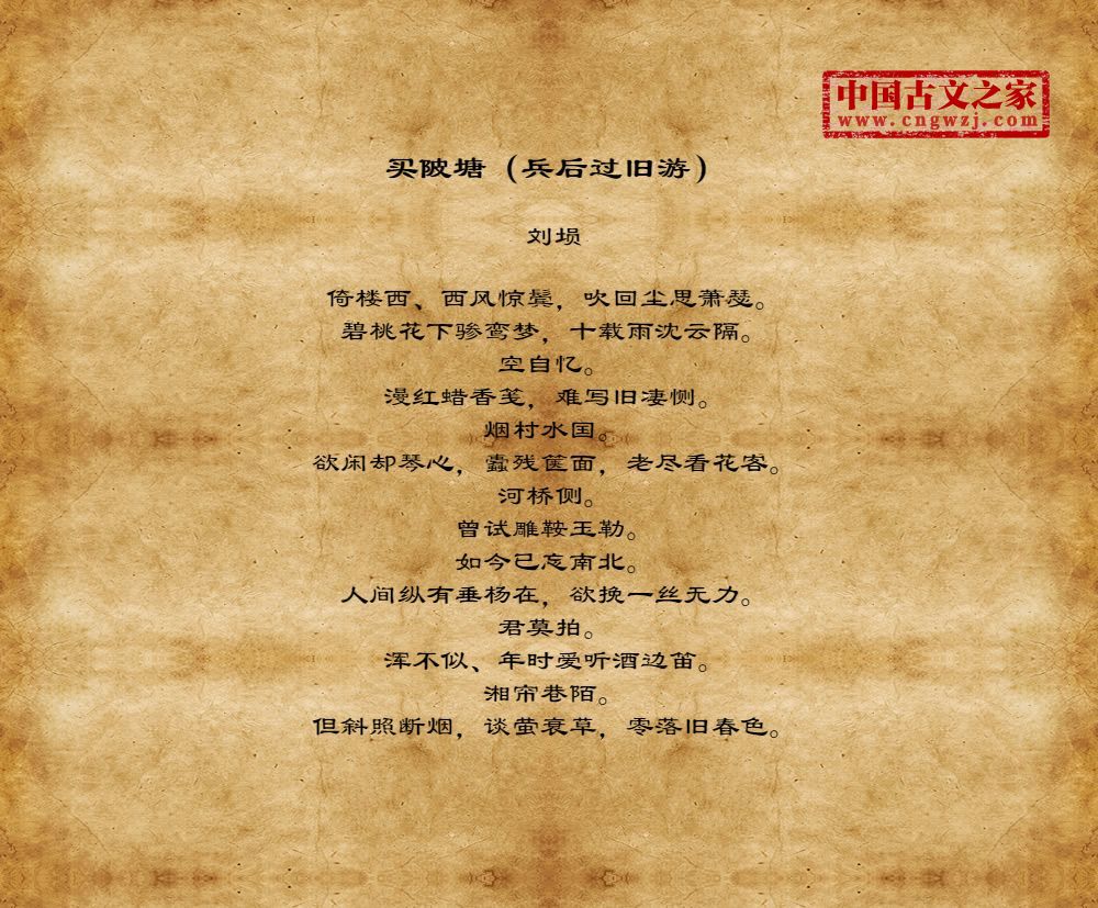 倚楼西、西风惊鬓,吹回尘思萧瑟。碧桃花下骖鸾梦,十载雨沈云隔。空自忆。漫红蜡香笺,难写旧凄恻。烟村水国。欲闲却琴心,蠹残箧面,老尽看花客。河桥侧。曾试雕鞍玉勒。如今已忘南北。人间纵有垂杨在,欲挽一丝无力。君莫拍。浑不似、年时爱听酒边笛。湘帘巷陌。但斜照断烟,谈萤衰草,零落旧春色。