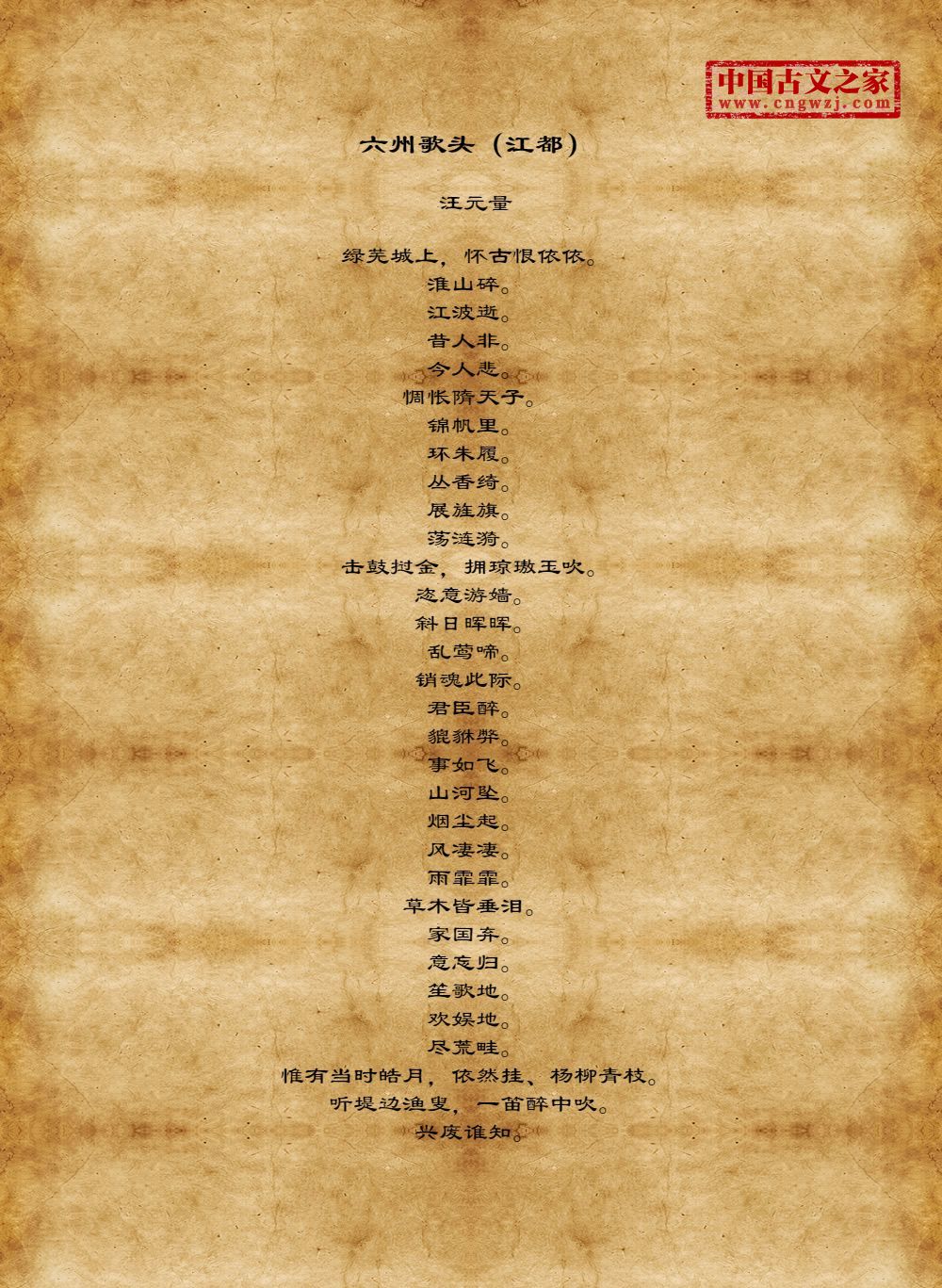 绿芜城上,怀古恨依依。淮山碎。江波逝。昔人非。今人悲。惆怅隋天子。锦帆里。环朱履。丛香绮。展旌旗。荡涟漪。击鼓挝金,拥琼璈玉吹。恣意游嫱。斜日晖晖。乱莺啼。销魂此际。君臣醉。貔貅弊。事如飞。山河坠。烟尘起。风凄凄。雨霏霏。草木皆垂泪。家国弃。意忘归。笙歌地。欢娱地。尽荒畦。惟有当时皓月,依然挂、杨柳青枝。听堤边渔叟,一笛醉中吹。兴废谁知。