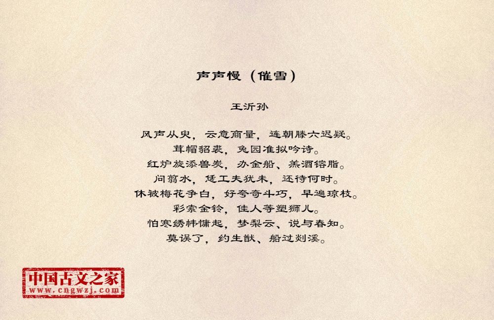 风声从臾,云意商量,连朝滕六迟疑。茸帽貂裘,兔园准拟吟诗。红炉旋添兽炭,办金船、羔酒镕脂。问翦水,恁工夫犹未,还待何时。休被梅花争白,好夸奇斗巧,早遍琼枝。彩索金铃,佳人等塑狮儿。怕寒绣帏慵起,梦梨云、说与春知。莫误了,约生猷、船过剡溪。