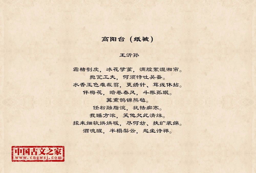 霜楮刳皮,冰花擘茧,满腔絮湿湘帘。抱瓮工夫,何须待吐吴蚕。水香玉色难裁翦,更绣针、茸线休拈。伴梅花,暗卷春风,斗帐孤眠。篝熏鹊锦熊毡。任粉融脂涴,犹怯痴寒。我睡方浓,笑他欠此清缘。揉来细软烘烘暖,尽何妨、挟纩装绵。酒魂醒,半榻梨云,起坐诗禅。