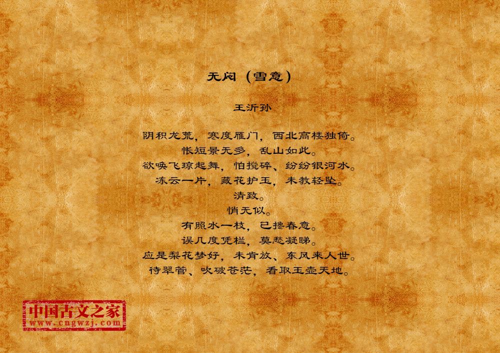 阴积龙荒,寒度雁门,西北高楼独倚。怅短景无多,乱山如此。欲唤飞琼起舞,怕搅碎、纷纷银河水。冻云一片,藏花护玉,未教轻坠。清致。悄无似。有照水一枝,已搀春意。误几度凭栏,莫愁凝睇。应是梨花梦好,未肯放、东风来人世。待翠管、吹破苍茫,看取玉壶天地。