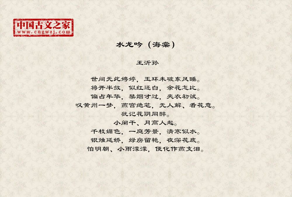 世间无此娉婷,玉环未破东风睡。将开半敛,似红还白,余花怎比。偏占年华,禁烟才过,夹衣初试。叹黄州一梦,燕宫绝笔,无人解、看花意。犹记花阴同醉。小阑干、月高人起。千枝媚色,一庭芳景,清寒似水。银烛延娇,绿房留艳,夜深花底。怕明朝、小雨濛濛,便化作燕支泪。