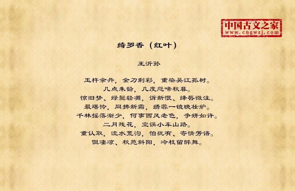 玉杵余丹,金刀剩彩,重染吴江孤树。几点朱铅,几度怨啼秋暮。惊旧梦、绿鬓轻凋,诉新恨、绛唇微注。最堪怜,同拂新霜,绣蓉一镜晚妆妒。千林摇落渐少,何事西风老色,争妍如许。二月残花,空误小车山路。重认取,流水荒沟,怕犹有、寄情芳语。但凄凉、秋苑斜阳,冷枝留醉舞。