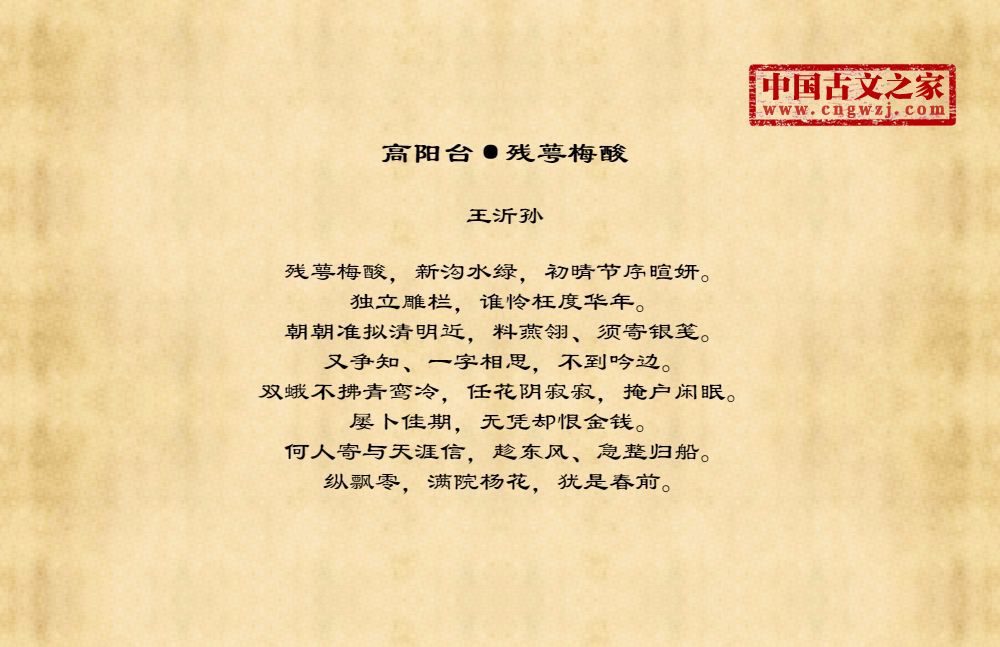 残萼梅酸,新沟水绿,初晴节序暄妍。独立雕栏,谁怜枉度华年。朝朝准拟清明近,料燕翎、须寄银笺。又争知、一字相思,不到吟边。双蛾不拂青鸾冷,任花阴寂寂,掩户闲眠。屡卜佳期,无凭却恨金钱。何人寄与天涯信,趁东风、急整归船。纵飘零,满院杨花,犹是春前。
