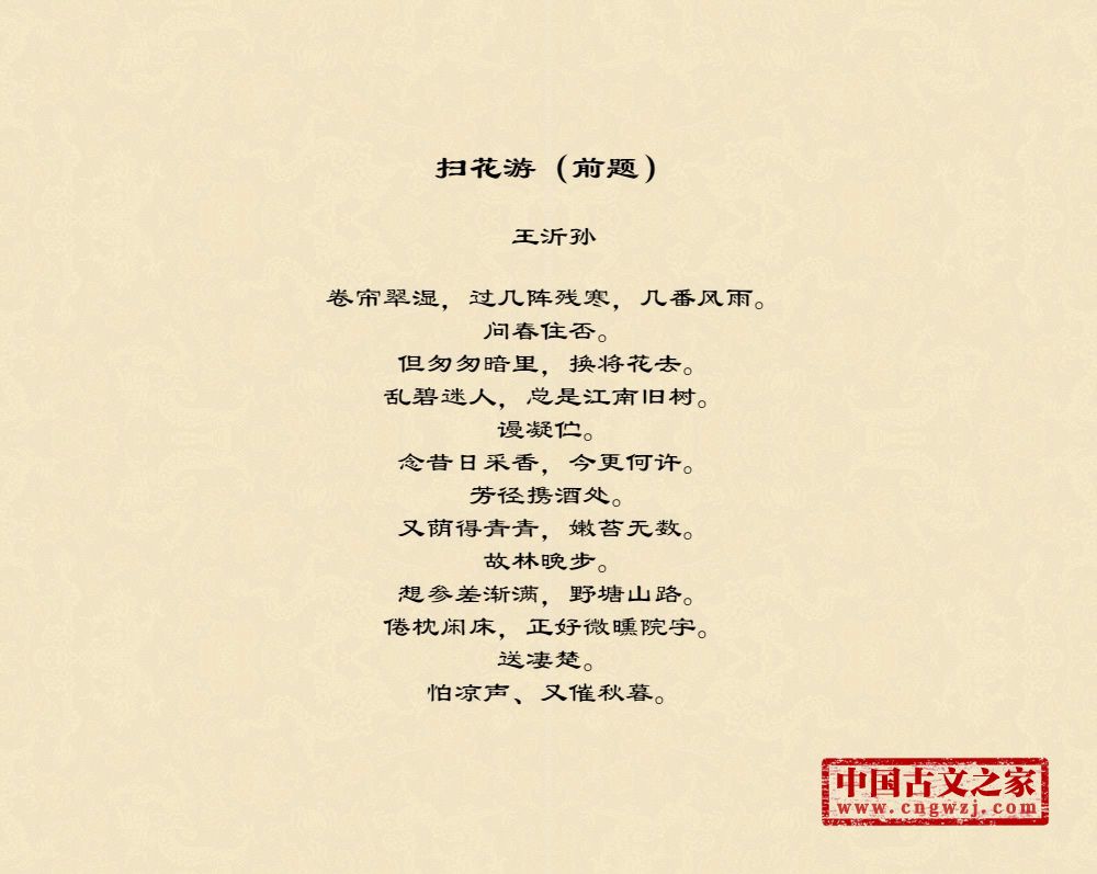 卷帘翠湿,过几阵残寒,几番风雨。问春住否。但匆匆暗里,换将花去。乱碧迷人,总是江南旧树。谩凝伫。念昔日采香,今更何许。芳径携酒处。又荫得青青,嫩苔无数。故林晚步。想参差渐满,野塘山路。倦枕闲床,正好微曛院宇。送凄楚。怕凉声、又催秋暮。