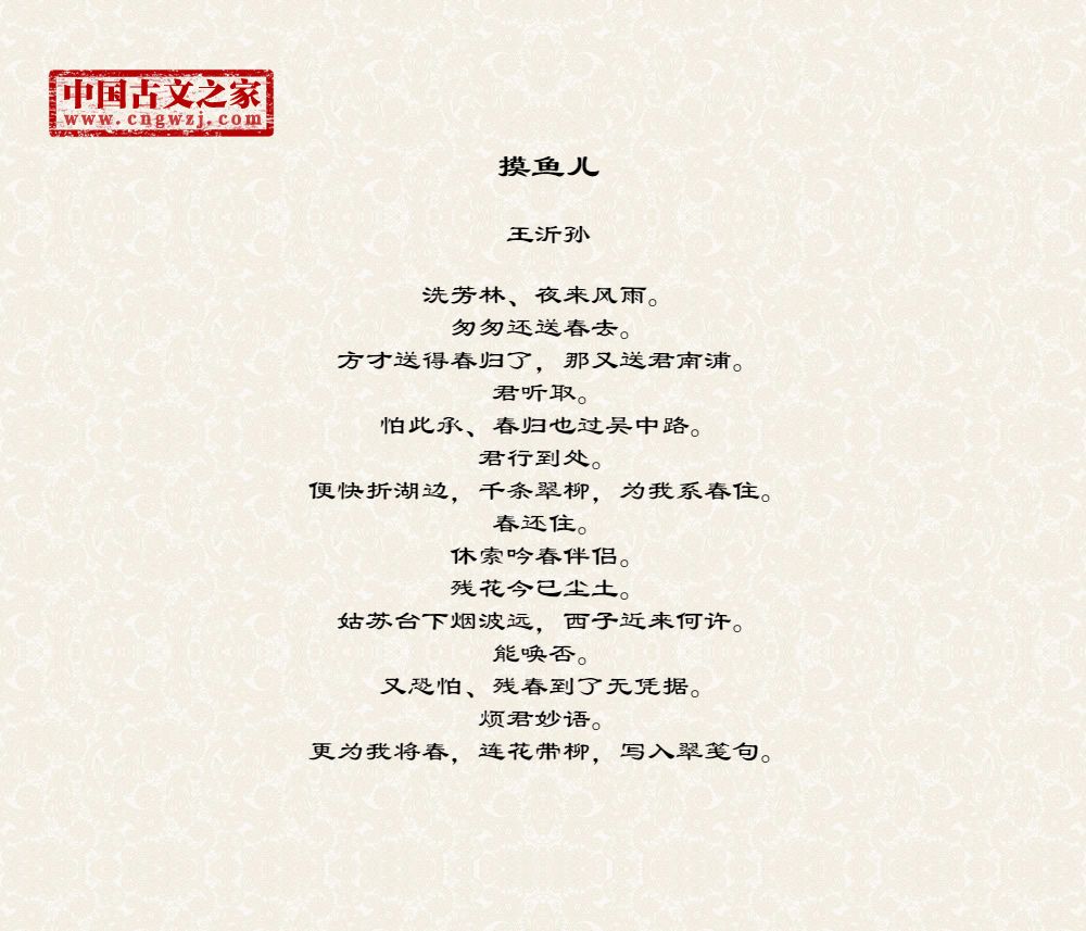 洗芳林、夜来风雨。匆匆还送春去。方才送得春归了,那又送君南浦。君听取。怕此承、春归也过吴中路。君行到处。便快折湖边,千条翠柳,为我系春住。春还住。休索吟春伴侣。残花今已尘土。姑苏台下烟波远,西子近来何许。能唤否。又恐怕、残春到了无凭据。烦君妙语。更为我将春,连花带柳,写入翠笺句。