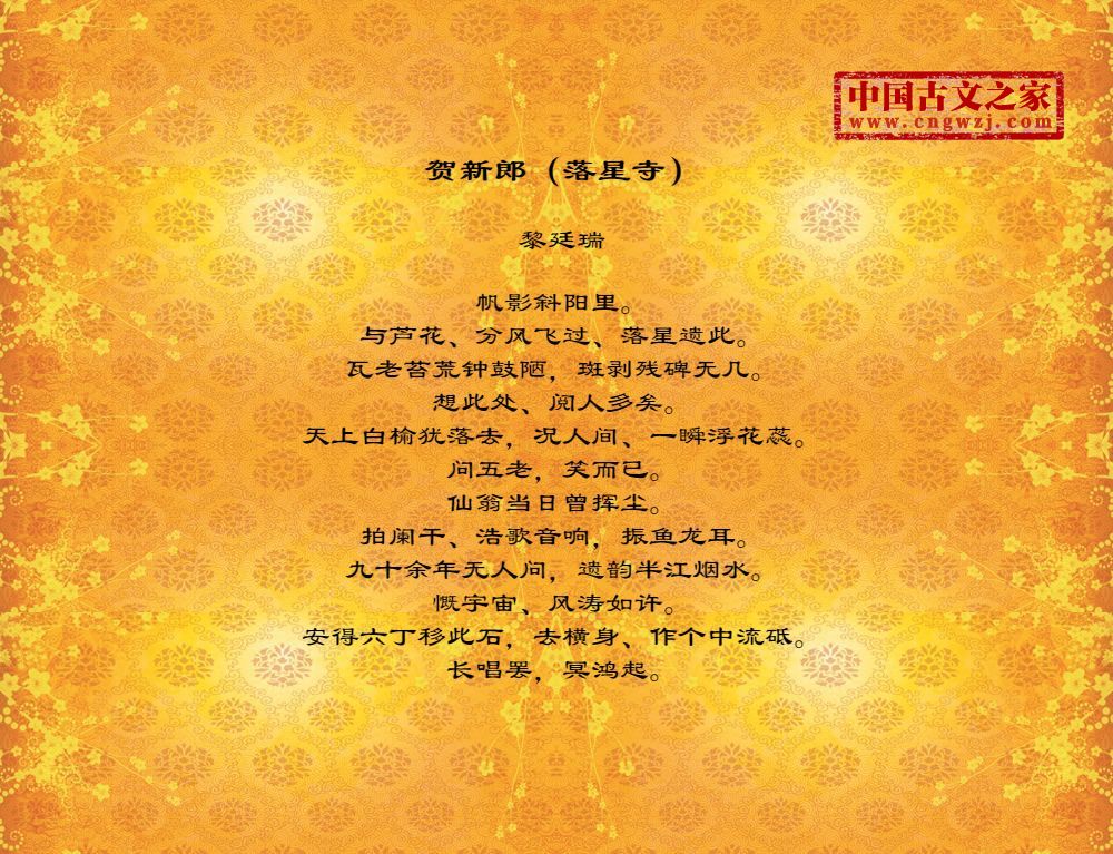 帆影斜阳里。与芦花、分风飞过、落星遗此。瓦老苔荒钟鼓陋,斑剥残碑无几。想此处、阅人多矣。天上白榆犹落去,况人间、一瞬浮花蕊。问五老,笑而已。仙翁当日曾挥尘。拍阑干、浩歌音响,振鱼龙耳。九十余年无人问,遗韵半江烟水。慨宇宙、风涛如许。安得六丁移此石,去横身、作个中流砥。长唱罢,冥鸿起。