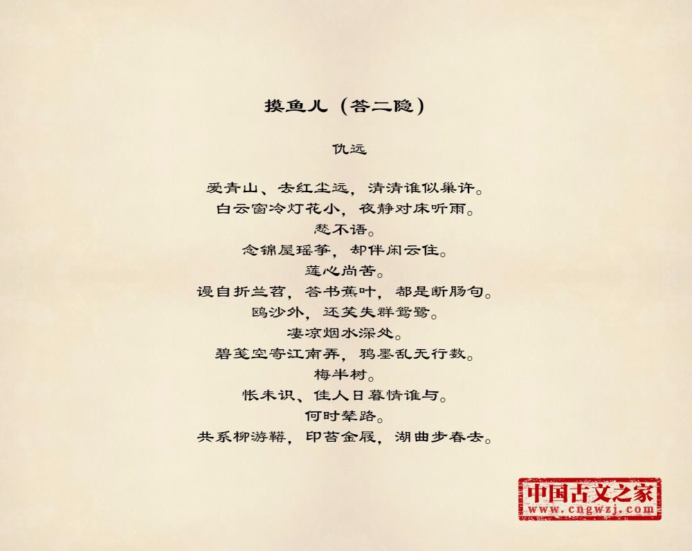 爱青山、去红尘远,清清谁似巢许。白云窗冷灯花小,夜静对床听雨。愁不语。念锦屋瑶筝,却伴闲云住。莲心尚苦。谩自折兰苕,答书蕉叶,都是断肠句。鸥沙外,还笑失群鸳鹭。凄凉烟水深处。碧笺空寄江南弄,鸦墨乱无行数。梅半树。怅未识、佳人日暮情谁与。何时辇路。共系柳游鞯,印苔金屐,湖曲步春去。