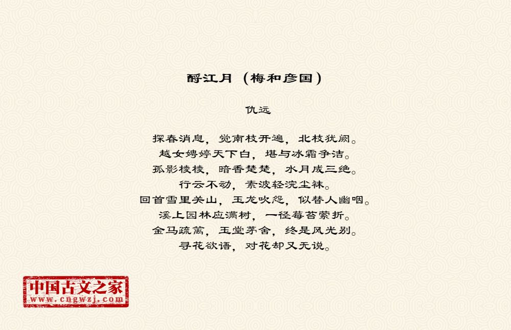 探春消息,觉南枝开遍,北枝犹阙。越女娉婷天下白,堪与冰霜争洁。孤影棱棱,暗香楚楚,水月成三绝。行云不动,素波轻浣尘袜。回首雪里关山,玉龙吹怨,似替人幽咽。溪上园林应满树,一径莓苔萦折。金马疏篱,玉堂茅舍,终是风光别。寻花欲语,对花却又无说。