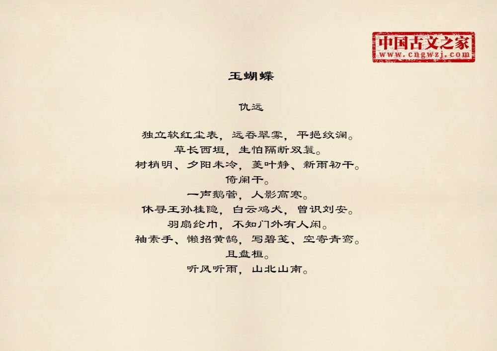 独立软红尘表,远吞翠雾,平挹纹澜。草长西垣,生怕隔断双鬟。树梢明、夕阳未冷,菱叶静、新雨初干。倚阑干。一声鹅管,人影高寒。休寻王孙桂隐,白云鸡犬,曾识刘安。羽扇纶巾,不知门外有人闲。袖素手、懒招黄鹄,写碧笺、空寄青鸾。且盘桓。听风听雨,山北山南。
