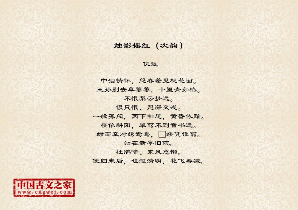 中酒情怀,怨春羞见桃花面。王孙别去草萋萋,十里青如染。不恨梨云梦远。恨只恨、盟深交浅。一般孤闷,两下相思,黄昏依黯。楼依斜阳,翠鸾不到音书远。绿窗空对绣鸳鸯,□缕凭谁翦。知在新亭旧院。杜鹃啼、东风意懒。便归来后,也过清明,花飞春减。