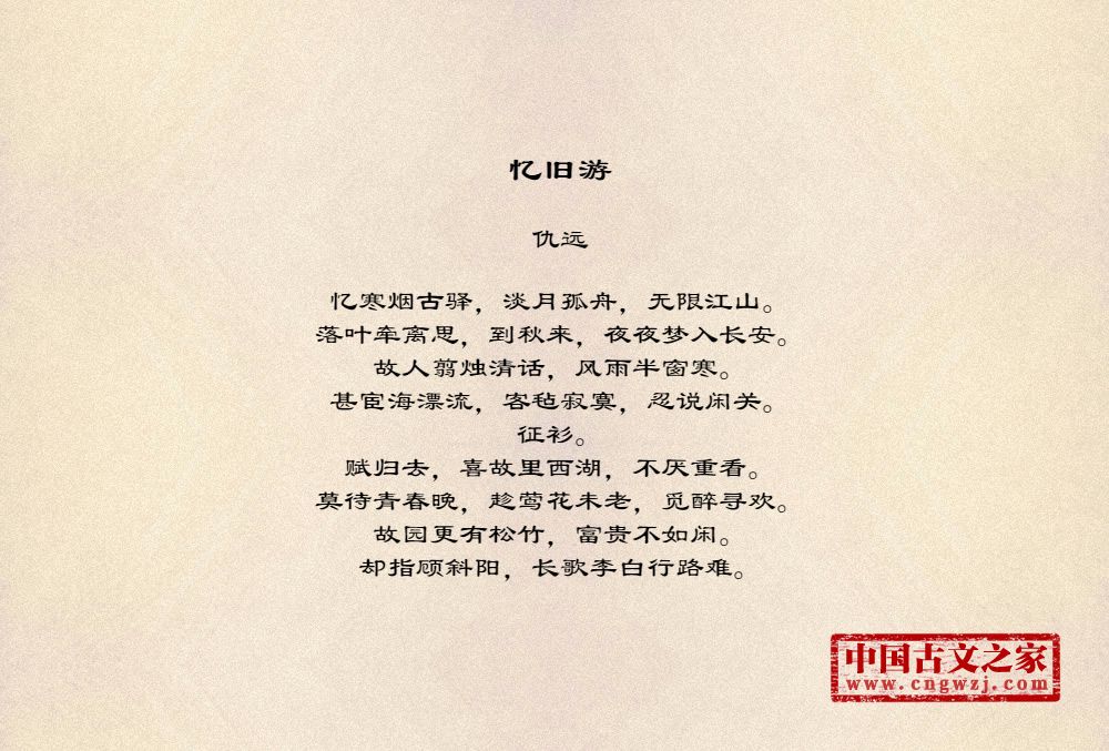 忆寒烟古驿,淡月孤舟,无限江山。落叶牵离思,到秋来,夜夜梦入长安。故人翦烛清话,风雨半窗寒。甚宦海漂流,客毡寂寞,忍说闲关。征衫。赋归去,喜故里西湖,不厌重看。莫待青春晚,趁莺花未老,觅醉寻欢。故园更有松竹,富贵不如闲。却指顾斜阳,长歌李白行路难。