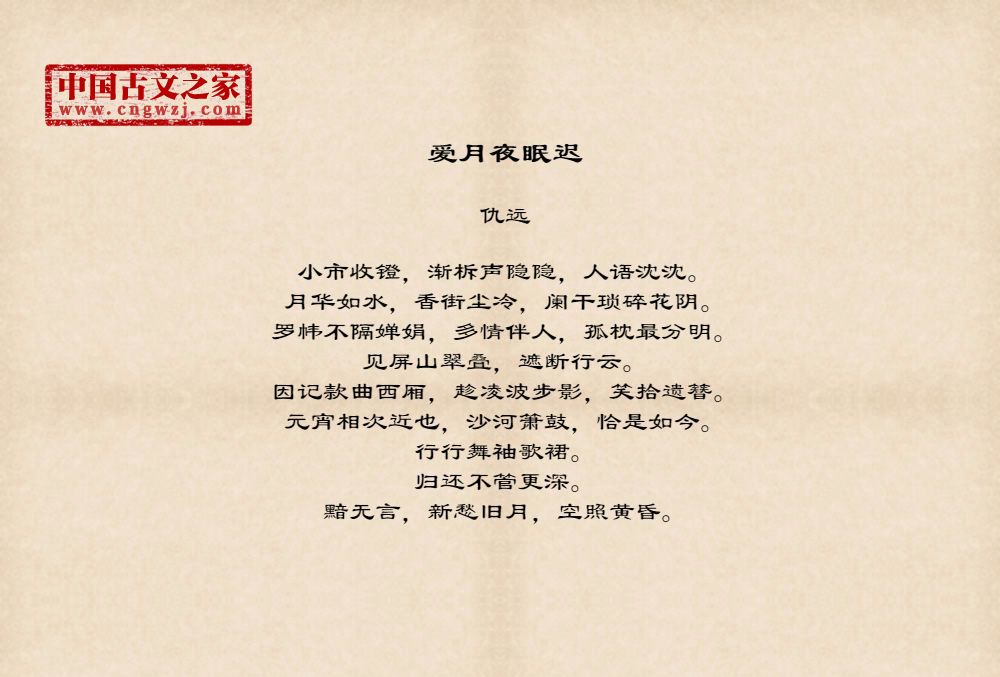 小市收镫,渐柝声隐隐,人语沈沈。月华如水,香街尘冷,阑干琐碎花阴。罗帏不隔婵娟,多情伴人,孤枕最分明。见屏山翠叠,遮断行云。因记款曲西厢,趁凌波步影,笑拾遗簪。元宵相次近也,沙河箫鼓,恰是如今。行行舞袖歌裙。归还不管更深。黯无言,新愁旧月,空照黄昏。