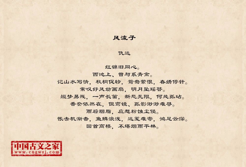 红锦旧同心。西池上、曾与系青禽。记山水写情,秋桐促轸,鸳鸯萦恨,春绣停针。常叹好风妨画扇,明月坠瑶簪。短梦易残,一声长笛,新愁无限,何处孤砧。香奁依然在,但鸾镜、孤影渺渺难寻。雨后胭脂,应想粉蚀尘侵。怅去帆渐杳,鱼鳞浪浅,远笺难寄,鸿尾云深。回首高楼,不堪烟雨平林。