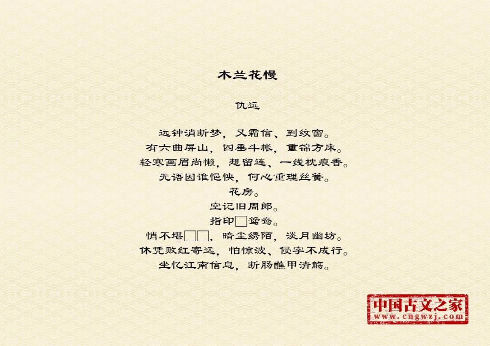 远钟消断梦,又霜信、到纹窗。有六曲屏山,四垂斗帐,重锦方床。轻寒画眉尚懒,想留连、一线枕痕香。无语因谁悒怏,何心重理丝簧。花房。空记旧周郎。指印□鸳鸯。悄不堪□□,暗尘绣陌,淡月幽坊。休凭败红寄远,怕惊波、侵字不成行。坐忆江南信息,断肠蘸甲清觞。