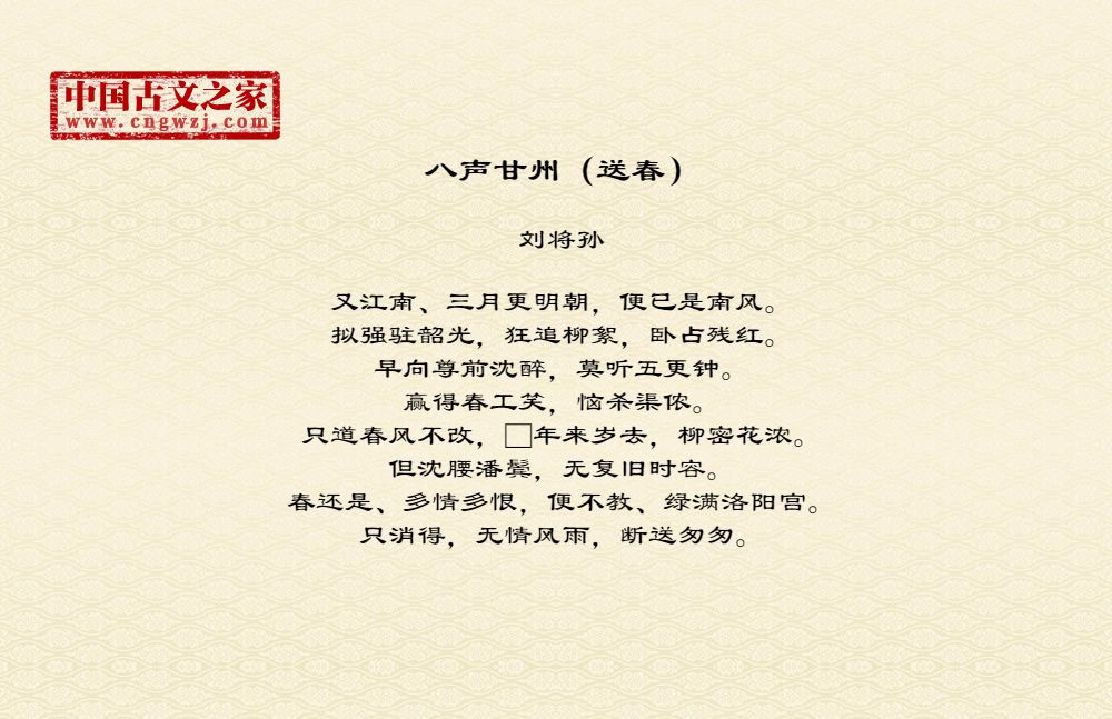 又江南、三月更明朝,便已是南风。拟强驻韶光,狂追柳絮,卧占残红。早向尊前沈醉,莫听五更钟。赢得春工笑,恼杀渠侬。只道春风不改,□年来岁去,柳密花浓。但沈腰潘鬓,无复旧时容。春还是、多情多恨,便不教、绿满洛阳宫。只消得,无情风雨,断送匆匆。