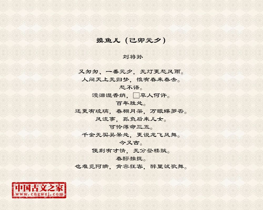 又匆匆、一番元夕,无灯更愁风雨。人间天上无归梦,惟有春来春去。愁不语。漫泪湿香绡,□草人何许。百年胜处。还更有琉璃,春棚月架,万眼蝶罗否。风流事,孤负后来儿女。可怜薄命三五。千金无买吴呆处,更说龙飞凤舞。今又古。便剩有才情,无分登楼赋。春醪独抚。也难觅阿瞒,肯容狂客,醉里试歌舞。