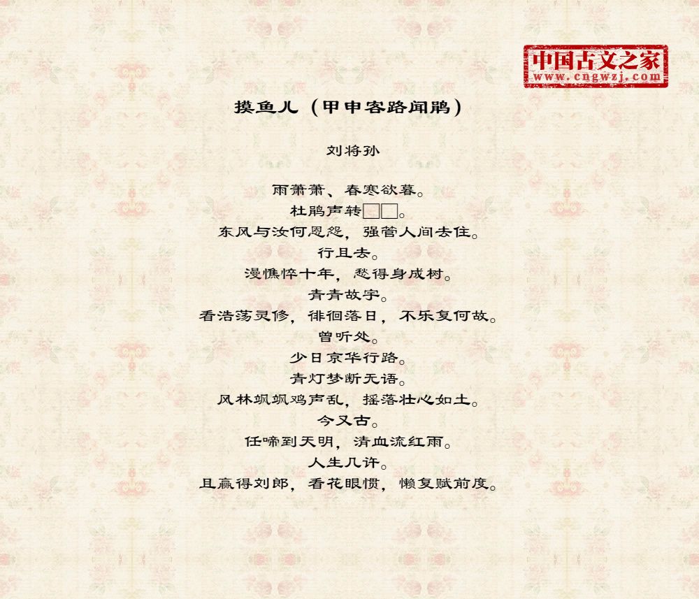 雨萧萧、春寒欲暮。杜鹃声转□□。东风与汝何恩怨,强管人间去住。行且去。漫憔悴十年,愁得身成树。青青故宇。看浩荡灵修,徘徊落日,不乐复何故。曾听处。少日京华行路。青灯梦断无语。风林飒飒鸡声乱,摇落壮心如土。今又古。任啼到天明,清血流红雨。人生几许。且赢得刘郎,看花眼惯,懒复赋前度。