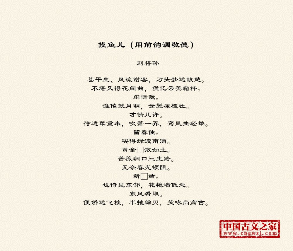 甚平生、风流谢客,刀头梦送酸楚。不堪又得花间曲,猛忆云英霜杵。闲情赋。谁催就月明,云鬓犀梳吐。才情几许。待遗策重来,吹箫一弄,鸾凤共轻举。留春住。买得绿波南浦。黄金□散如土。蔷薇洞口三生路。无奈春光顿阻。新□绪。也待见东邻,花艳墙低处。东风看取。便娇送飞梭,半摧编贝,笑咏尚高古。