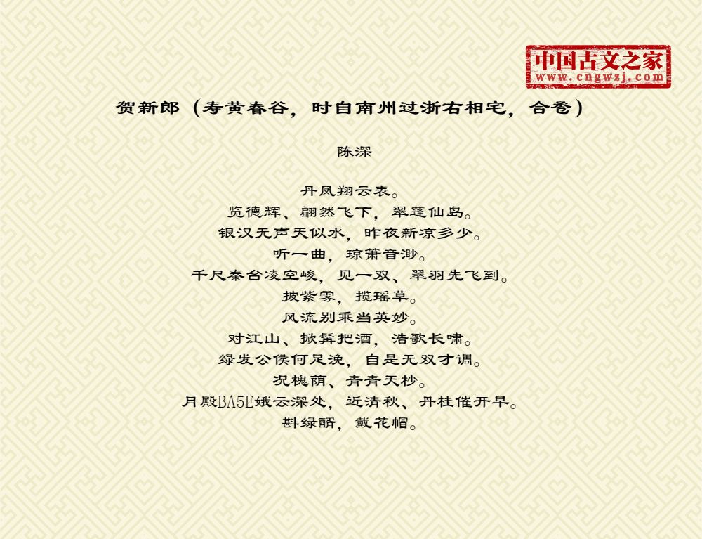 《贺新郎(寿黄春谷,时自南州过浙右相宅,合卺)》的原文打印版(陈深)