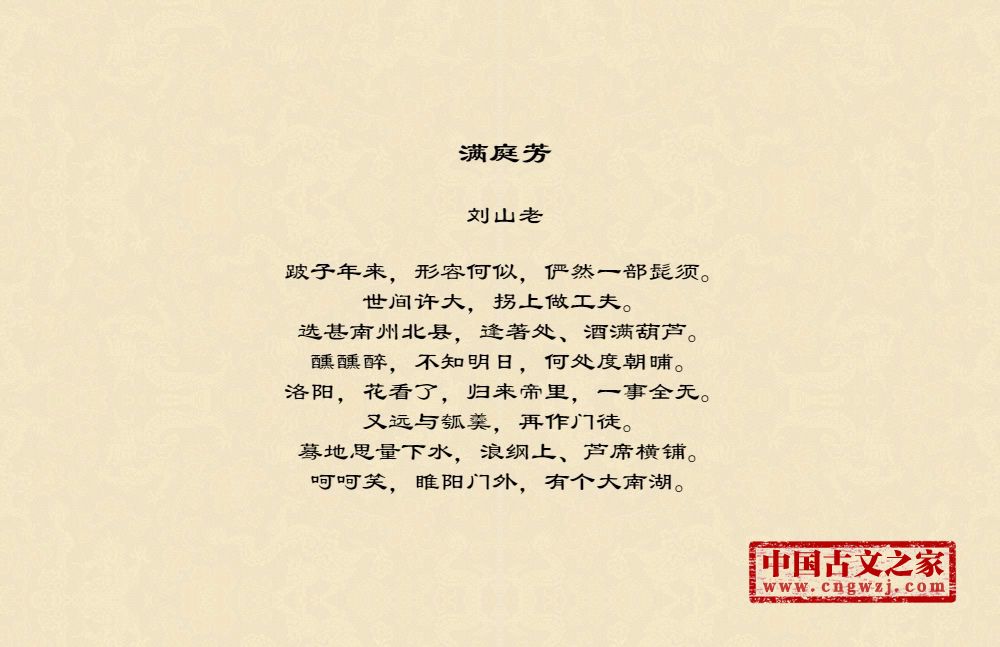 跛子年来,形容何似,俨然一部髭须。世间许大,拐上做工夫。选甚南州北县,逢著处、酒满葫芦。醺醺醉,不知明日,何处度朝晡。洛阳,花看了,归来帝里,一事全无。又远与瓠羹,再作门徒。蓦地思量下水,浪纲上、芦席横铺。呵呵笑,睢阳门外,有个大南湖。