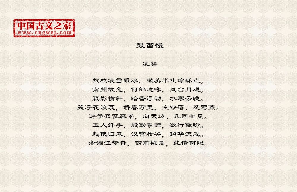 数枝凌雪乘冰,嫩英半吐琼酥点。南州故苑,何郎遗咏,风台月观。疏影横斜,暗香浮动,水寒云晚。笑浮花浪蕊,娇春万里,空零落、愁莺燕。游子寂寥暮景,向天边、几回相见。玉人纤手,殷勤攀赠,欲行微盼。越使归来,汉宫妆罢,昭华流怨。念湘江梦杳,窗前疑是,此情何限。