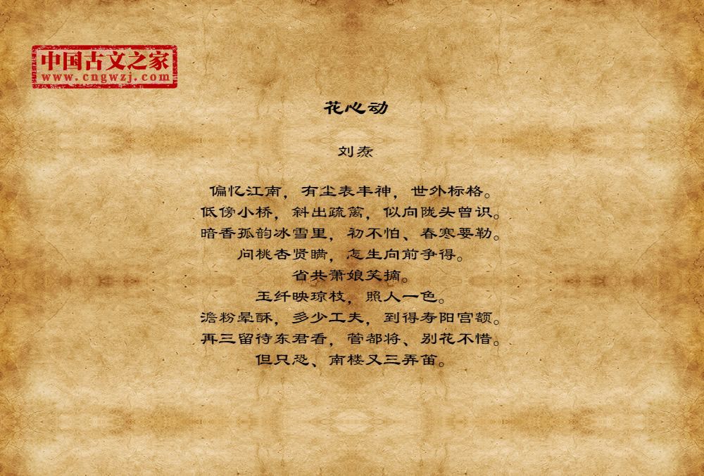 偏忆江南,有尘表丰神,世外标格。低傍小桥,斜出疏篱,似向陇头曾识。暗香孤韵冰雪里,初不怕、春寒要勒。问桃杏贤瞒,怎生向前争得。省共萧娘笑摘。玉纤映琼枝,照人一色。澹粉晕酥,多少工夫,到得寿阳宫额。再三留待东君看,管都将、别花不惜。但只恐、南楼又三弄笛。