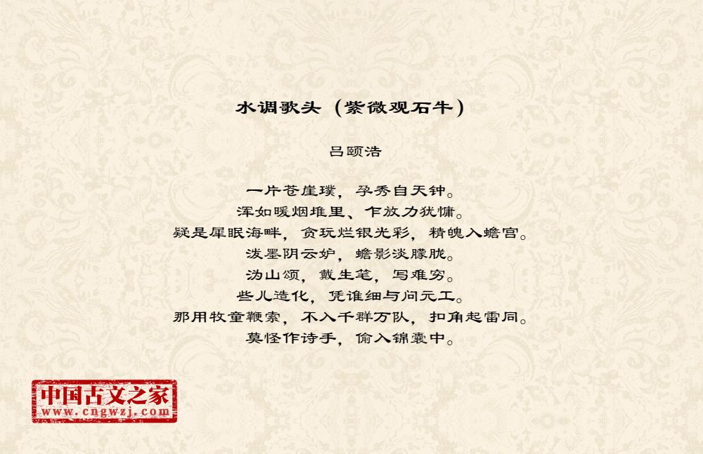 一片苍崖璞,孕秀自天钟。浑如暖烟堆里、乍放力犹慵。疑是犀眠海畔,贪玩烂银光彩,精魄入蟾宫。泼墨阴云妒,蟾影淡朦胧。沩山颂,戴生笔,写难穷。些儿造化,凭谁细与问元工。那用牧童鞭索,不入千群万队,扣角起雷同。莫怪作诗手,偷入锦囊中。