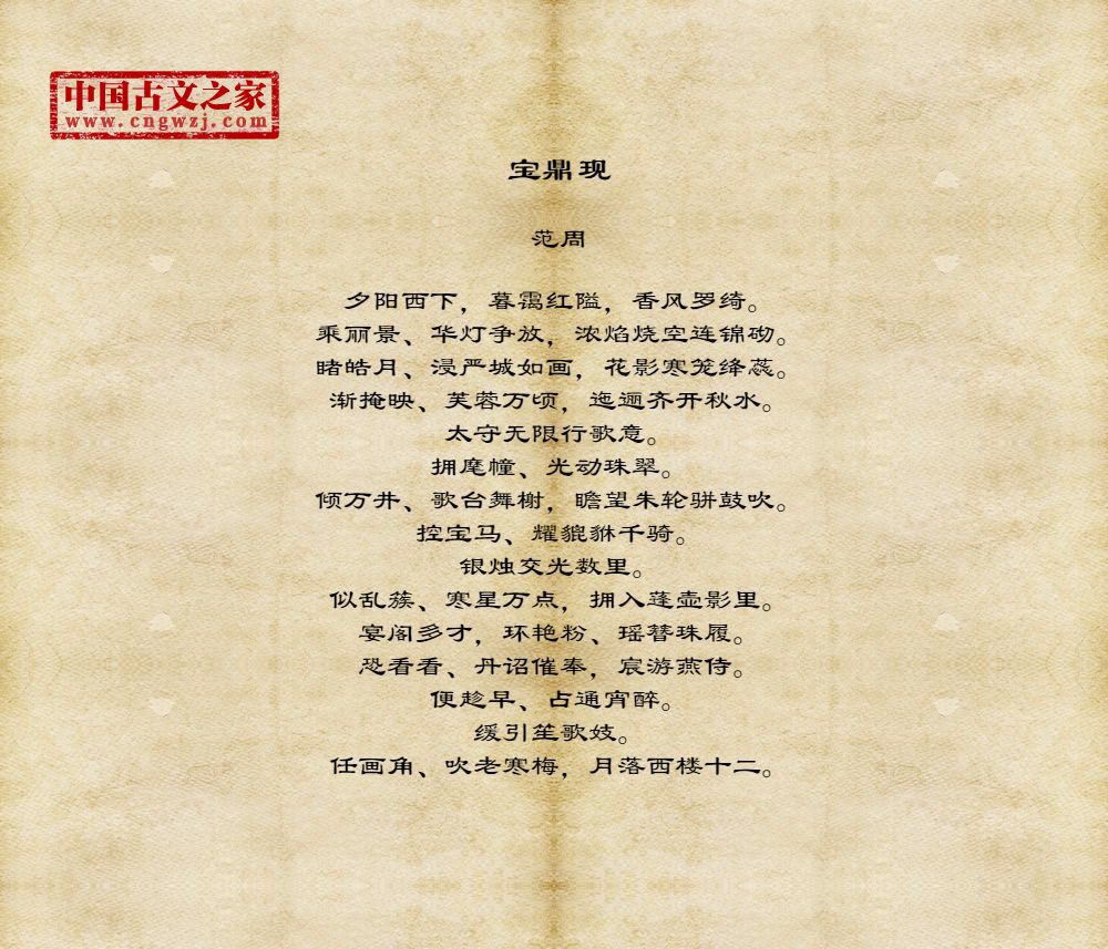 夕阳西下,暮霭红隘,香风罗绮。乘丽景、华灯争放,浓焰烧空连锦砌。睹皓月、浸严城如画,花影寒笼绛蕊。渐掩映、芙蓉万顷,迤逦齐开秋水。太守无限行歌意。拥麾幢、光动珠翠。倾万井、歌台舞榭,瞻望朱轮骈鼓吹。控宝马、耀貔貅千骑。银烛交光数里。似乱簇、寒星万点,拥入蓬壶影里。宴阁多才,环艳粉、瑶簪珠履。恐看看、丹诏催奉,宸游燕侍。便趁早、占通宵醉。缓引笙歌妓。任画角、吹老寒梅,月落西楼十二。