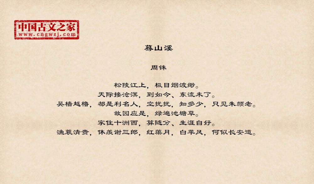 松陵江上,极目烟波缈。天际接沧溟,到如今、东流未了。吴樯越橹,都是利名人,空扰扰,知多少,只见朱颜老。故园应是,绿遍池塘草。家住十洲西,算随分、生涯自好。渔蓑清贵,休羡谢三郎,红蕖月,白苹风,何似长安道。