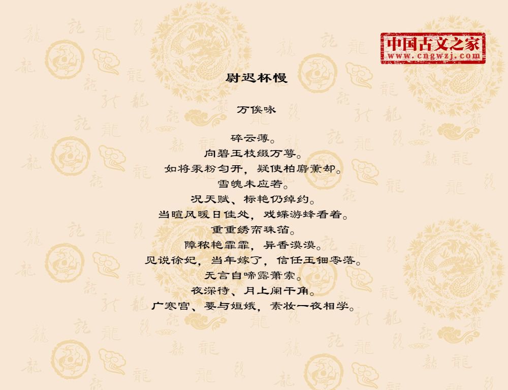 碎云薄。向碧玉枝缀万萼。如将汞粉匀开,疑使柏麝薰却。雪魄未应若。况天赋、标艳仍绰约。当暄风暖日佳处,戏蝶游蜂看着。重重绣帟珠箔。障秾艳霏霏,异香漠漠。见说徐妃,当年嫁了,信任玉钿零落。无言自啼露萧索。夜深待、月上阑干角。广寒宫、要与姮娥,素妆一夜相学。