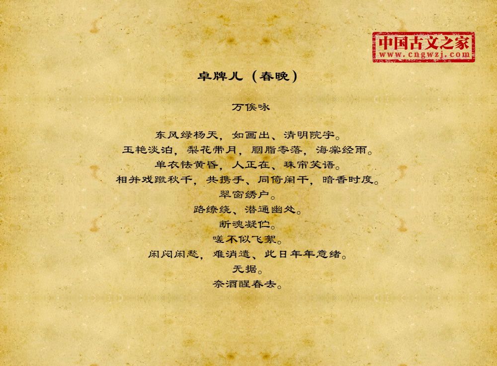 东风绿杨天,如画出、清明院宇。玉艳淡泊,梨花带月,胭脂零落,海棠经雨。单衣怯黄昏,人正在、珠帘笑语。相并戏蹴秋千,共携手、同倚阑干,暗香时度。翠窗绣户。路缭绕、潜通幽处。断魂凝伫。嗟不似飞絮。闲闷闲愁,难消遣、此日年年意绪。无据。奈酒醒春去。