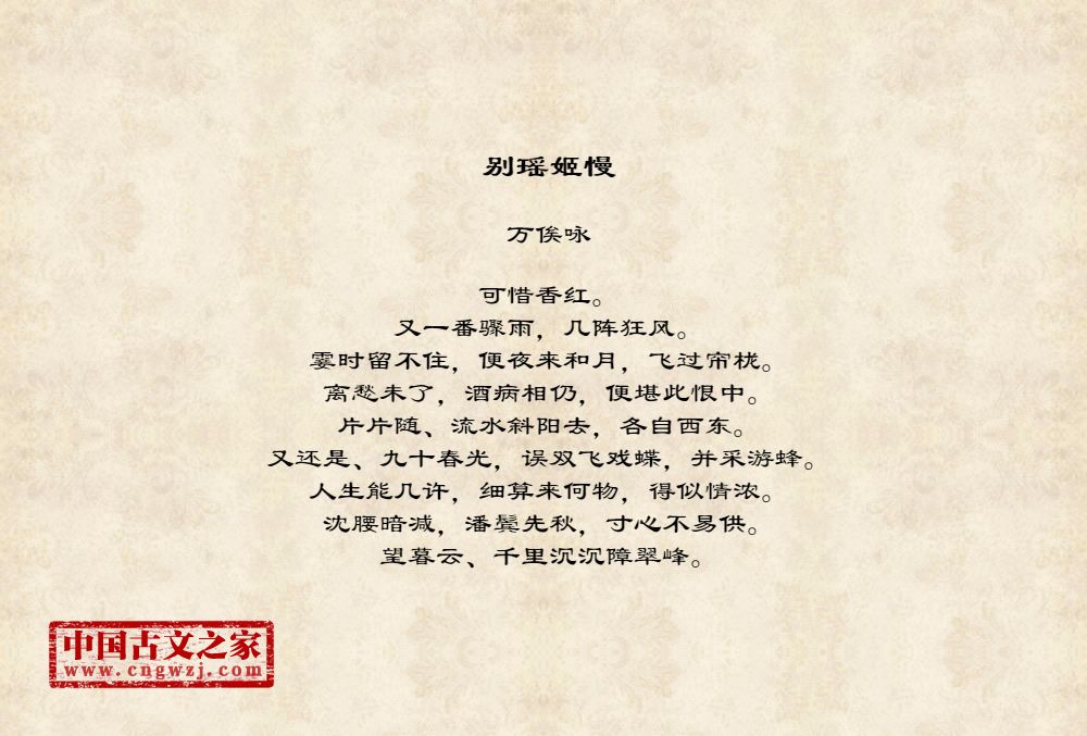 可惜香红。又一番骤雨,几阵狂风。霎时留不住,便夜来和月,飞过帘栊。离愁未了,酒病相仍,便堪此恨中。片片随、流水斜阳去,各自西东。又还是、九十春光,误双飞戏蝶,并采游蜂。人生能几许,细算来何物,得似情浓。沈腰暗减,潘鬓先秋,寸心不易供。望暮云、千里沉沉障翠峰。