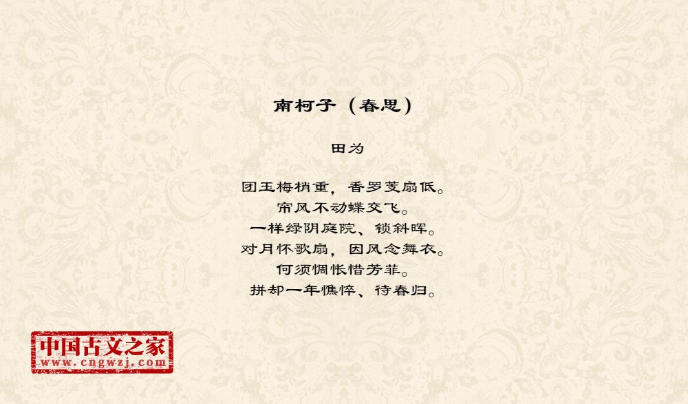 团玉梅梢重,香罗芰扇低。帘风不动蝶交飞。一样绿阴庭院、锁斜晖。对月怀歌扇,因风念舞衣。何须惆怅惜芳菲。拼却一年憔悴、待春归。