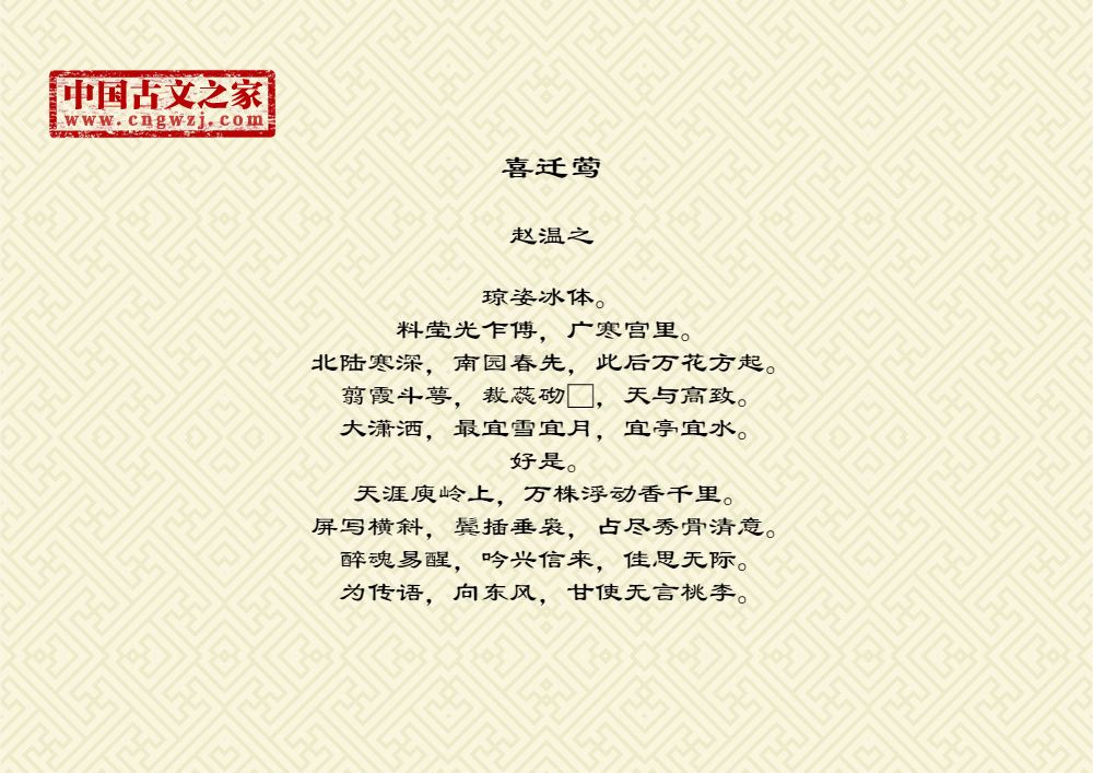琼姿冰体。料莹光乍傅,广寒宫里。北陆寒深,南园春先,此后万花方起。翦霞斗萼,裁蕊砌□,天与高致。大潇洒,最宜雪宜月,宜亭宜水。好是。天涯庾岭上,万株浮动香千里。屏写横斜,鬓插垂袅,占尽秀骨清意。醉魂易醒,吟兴信来,佳思无际。为传语,向东风,甘使无言桃李。