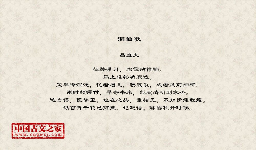 征鞍带月,浓露沾襟袖。马上轻衫峭寒透。望翠峰深浅,忆着眉儿,腰肢袅,忍看风前细柳。别时频嘱付,早寄书来,能趁清明到家否。这言语,便梦里、也在心头,重相见、不知伊瘦我瘦。纵百卉千花已离披,也趁得、酴醿牡丹时候。