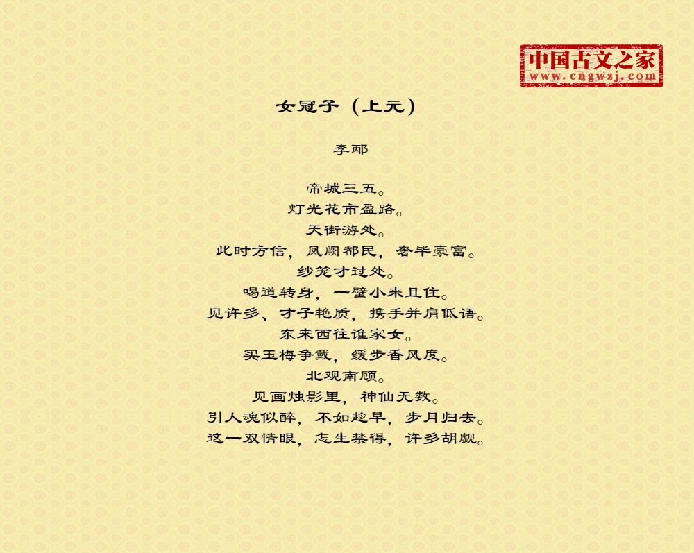 帝城三五。灯光花市盈路。天街游处。此时方信,凤阙都民,奢毕豪富。纱笼才过处。喝道转身,一壁小来且住。见许多、才子艳质,携手并肩低语。东来西往谁家女。买玉梅争戴,缓步香风度。北观南顾。见画烛影里,神仙无数。引人魂似醉,不如趁早,步月归去。这一双情眼,怎生禁得,许多胡觑。