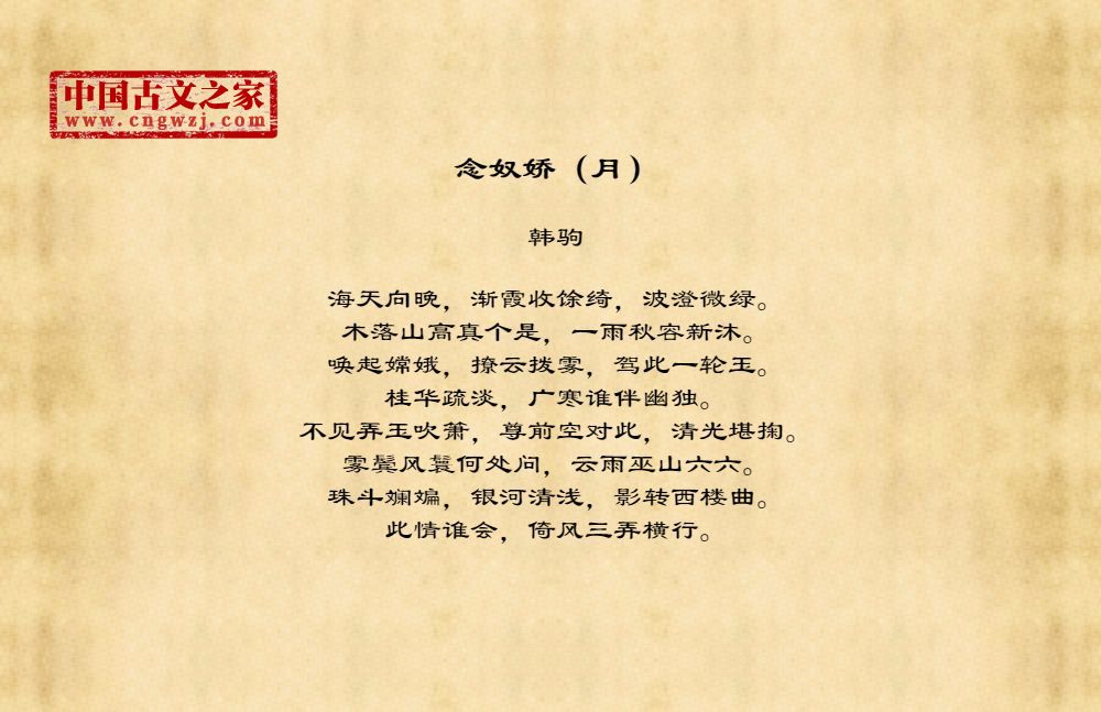 海天向晚,渐霞收馀绮,波澄微绿。木落山高真个是,一雨秋容新沐。唤起嫦娥,撩云拨雾,驾此一轮玉。桂华疏淡,广寒谁伴幽独。不见弄玉吹箫,尊前空对此,清光堪掬。雾鬓风鬟何处问,云雨巫山六六。珠斗斓斒,银河清浅,影转西楼曲。此情谁会,倚风三弄横行。