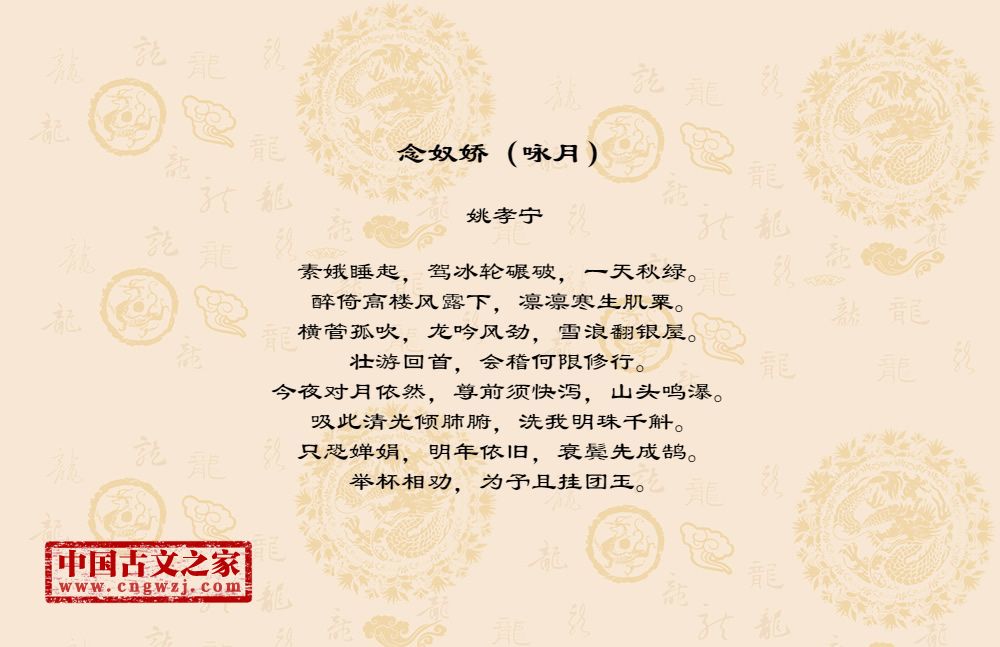 素娥睡起,驾冰轮碾破,一天秋绿。醉倚高楼风露下,凛凛寒生肌粟。横管孤吹,龙吟风劲,雪浪翻银屋。壮游回首,会稽何限修行。今夜对月依然,尊前须快泻,山头鸣瀑。吸此清光倾肺腑,洗我明珠千斛。只恐婵娟,明年依旧,衰鬓先成鹄。举杯相劝,为予且挂团玉。