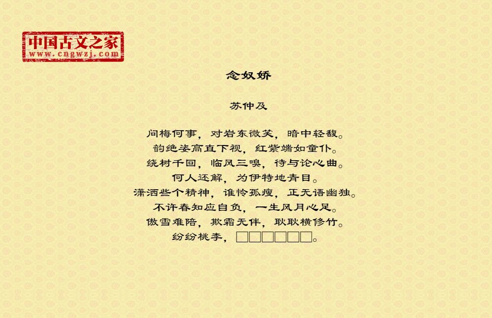 问梅何事,对岩东微笑,暗中轻馥。韵绝姿高直下视,红紫端如童仆。绕树千回,临风三嗅,待与论心曲。何人还解,为伊特地青目。潇洒些个精神,谁怜孤瘦,正无语幽独。不许春知应自负,一生风月心足。傲雪难陪,欺霜无伴,耿耿横修竹。纷纷桃李,□□□□□□。