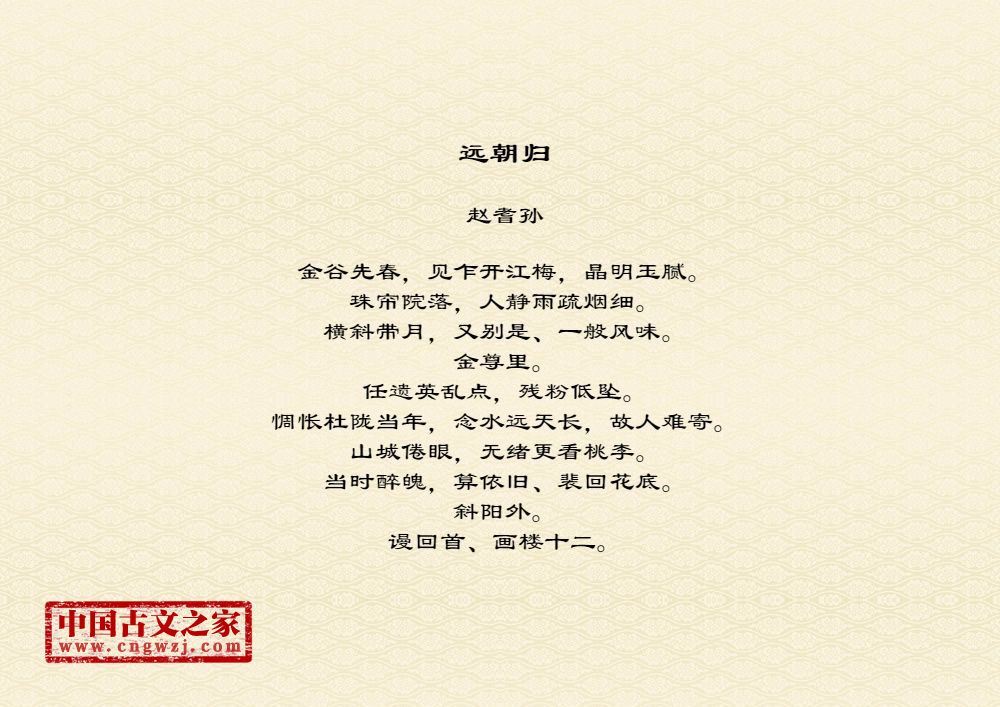 金谷先春,见乍开江梅,晶明玉腻。珠帘院落,人静雨疏烟细。横斜带月,又别是、一般风味。金尊里。任遗英乱点,残粉低坠。惆怅杜陇当年,念水远天长,故人难寄。山城倦眼,无绪更看桃李。当时醉魄,算依旧、裴回花底。斜阳外。谩回首、画楼十二。