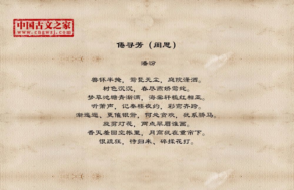 兽钚半掩,鸳甃无尘,庭院潇洒。树色沉沉,春尽燕娇莺姹。梦草池塘青渐满,海棠轩槛红相亚。听箫声,记秦楼夜约,彩鸾齐跨。渐迤逦、更催银箭,何处贪欢,犹系骄马。旋剪灯花,两点翠眉谁画。香灭羞回空帐里,月高犹在重帘下。恨疏狂,待归来、碎揉花打。