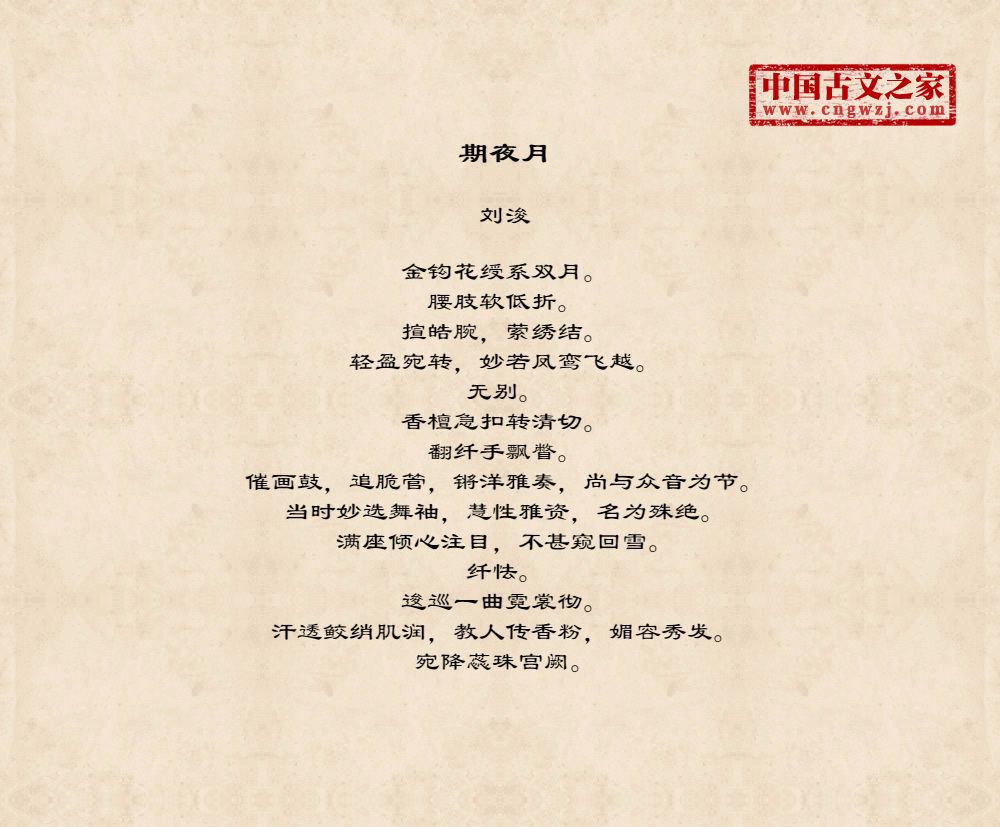 金钩花绶系双月。腰肢软低折。揎皓腕,萦绣结。轻盈宛转,妙若凤鸾飞越。无别。香檀急扣转清切。翻纤手飘瞥。催画鼓,追脆管,锵洋雅奏,尚与众音为节。当时妙选舞袖,慧性雅资,名为殊绝。满座倾心注目,不甚窥回雪。纤怯。逡巡一曲霓裳彻。汗透鲛绡肌润,教人传香粉,媚容秀发。宛降蕊珠宫阙。