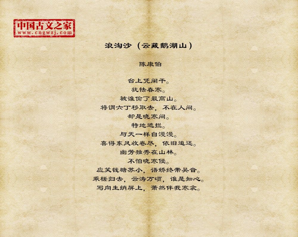 台上凭阑干。犹怯春寒。被谁偷了最高山。将谓六丁移取去,不在人间。却是晓寒间。特地遮拦。与天一样自漫漫。喜得东风收卷尽,依旧追还。幽芳独秀在山林。不怕晓寒侵。应笑钱塘苏小,语娇终带吴音。乘槎归去,云涛万顷,谁是知心。写向生绡屏上,萧然伴我寒衾。