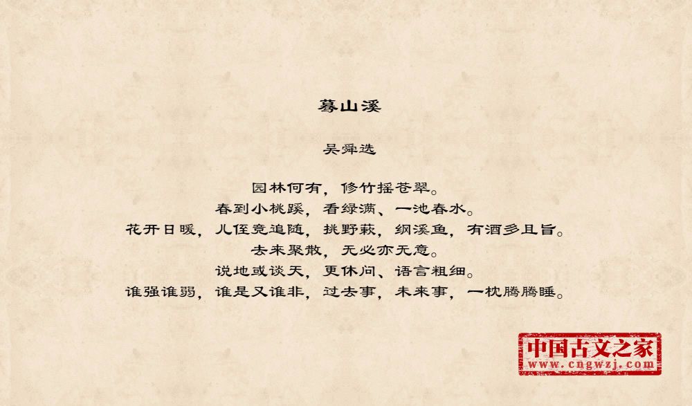 园林何有,修竹摇苍翠。春到小桃蹊,看绿满、一池春水。花开日暖,儿侄竞追随,挑野蔌,纲溪鱼,有酒多且旨。去来聚散,无必亦无意。说地或谈天,更休问、语言粗细。谁强谁弱,谁是又谁非,过去事,未来事,一枕腾腾睡。