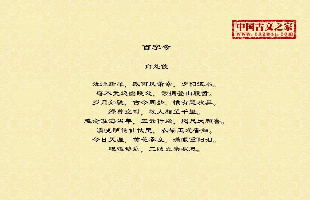 残蝉断雁,政西风萧索,夕阳流水。落木无边幽眺处,云拥登山屐齿。岁月如驰,古今同梦,惟有悲欢异。绿尊空对,故人相望千里。追念淮海当年,五云行殿,咫尺天颜喜。清晓胪传仙仗里,衣染玉龙香细。今日天涯,黄花零乱,满眼重阳泪。艰难多病,二陵无奈秋思。