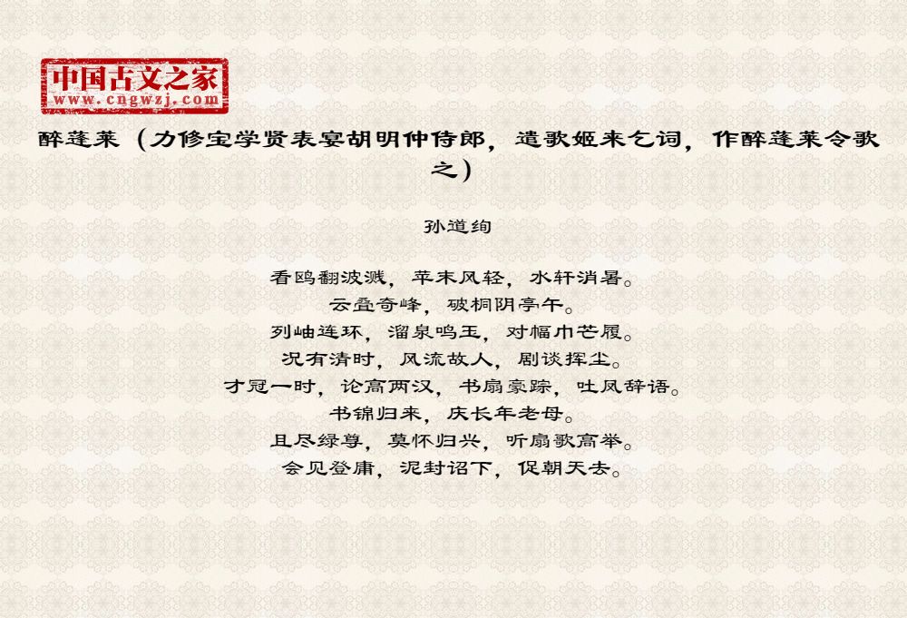 《醉蓬莱(力修宝学贤表宴胡明仲侍郎,遣歌姬来乞词,作醉蓬莱令歌之)》的原文打印版(孙道绚)