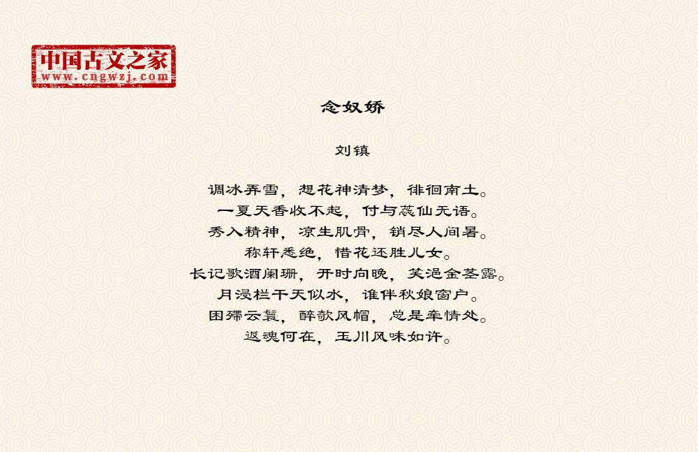 调冰弄雪,想花神清梦,徘徊南土。一夏天香收不起,付与蕊仙无语。秀入精神,凉生肌骨,销尽人间暑。称轩悉绝,惜花还胜儿女。长记歌酒阑珊,开时向晚,笑浥金茎露。月浸栏干天似水,谁伴秋娘窗户。困殢云鬟,醉欹风帽,总是牵情处。返魂何在,玉川风味如许。
