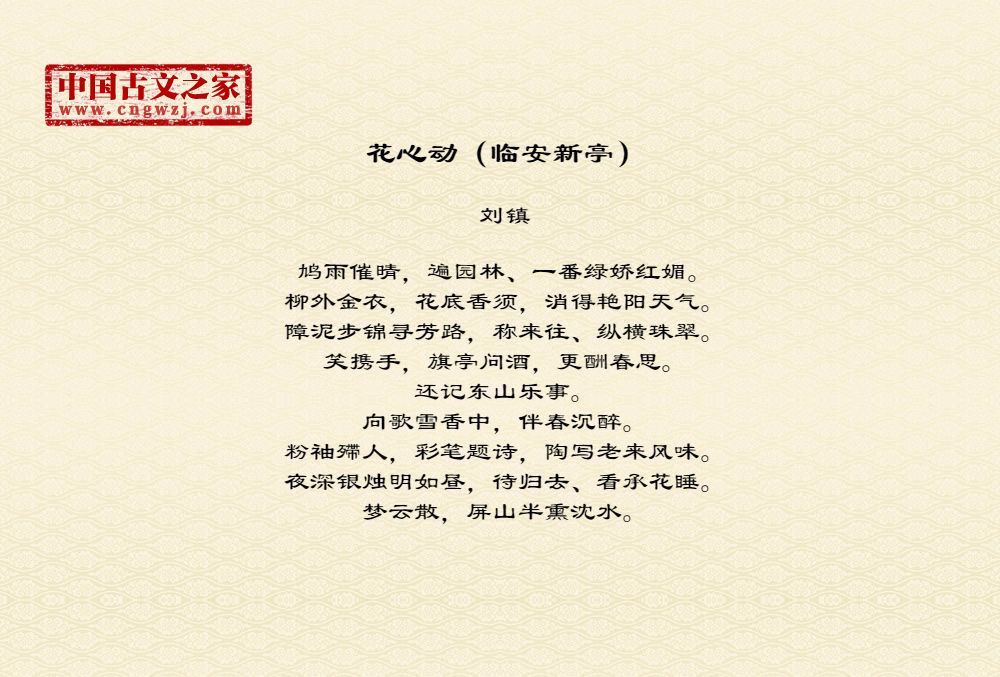 鸠雨催晴,遍园林、一番绿娇红媚。柳外金衣,花底香须,消得艳阳天气。障泥步锦寻芳路,称来往、纵横珠翠。笑携手,旗亭问酒,更酬春思。还记东山乐事。向歌雪香中,伴春沉醉。粉袖殢人,彩笔题诗,陶写老来风味。夜深银烛明如昼,待归去、看承花睡。梦云散,屏山半熏沈水。